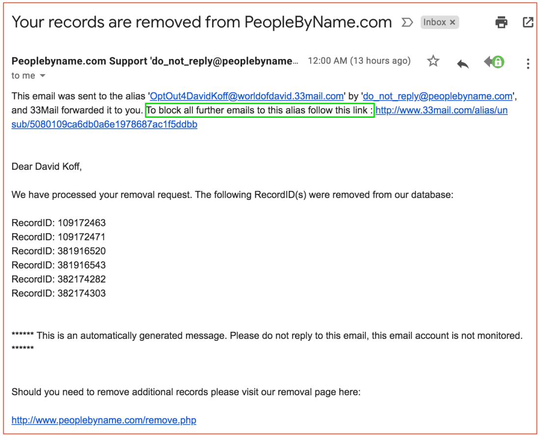 Here’s a typical confirmation email which, in this case, I received from a data broker called PeopleByName. As you can see, in PeopleByName’s case, I had to submit “RecordID” numbers associated with my name/information on their website: