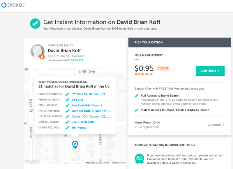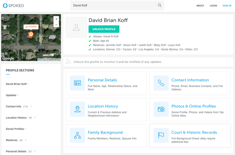 Spokeo.com is easy to search and provides a TON of personal information about every David Koff listed, including age, gender, relatives, and - get this - a map to a recent address. The cost to access this amount of data? Free. #TotallyCreepy