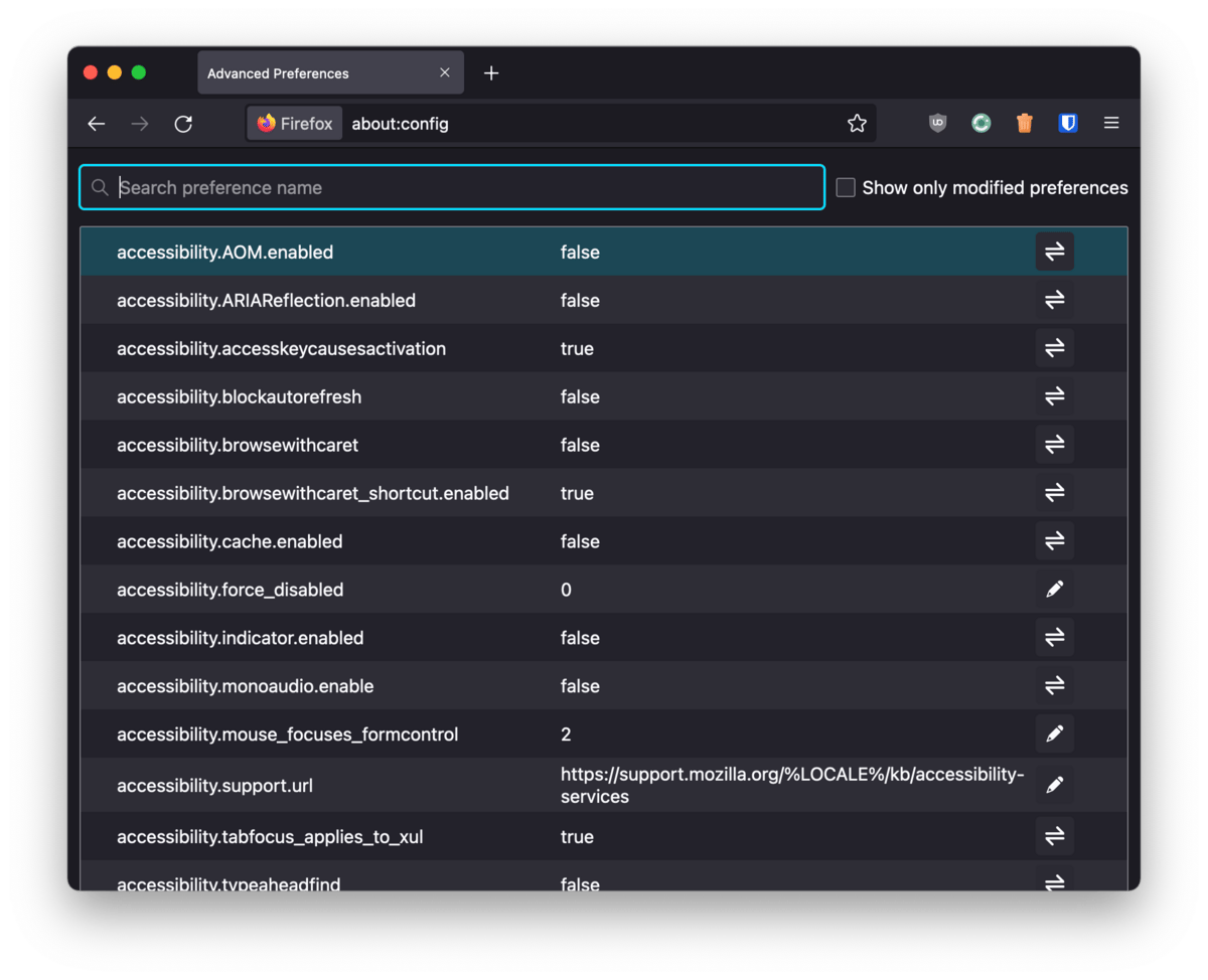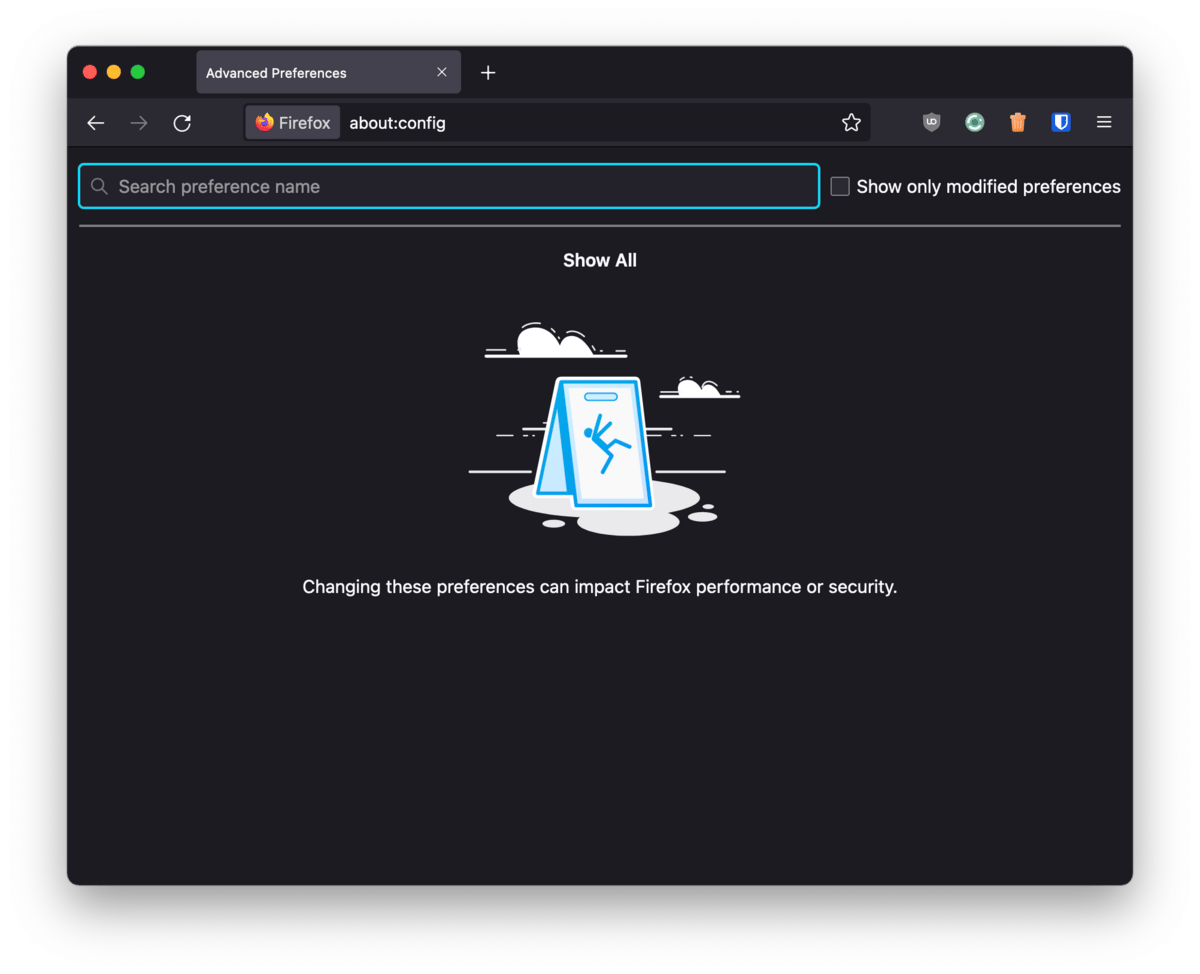 In your browser URL bar, type about:config and then press return. Surprise! You’ll be met with a screen with a “caution” graphic, a search bar and a button saying “Show All”.