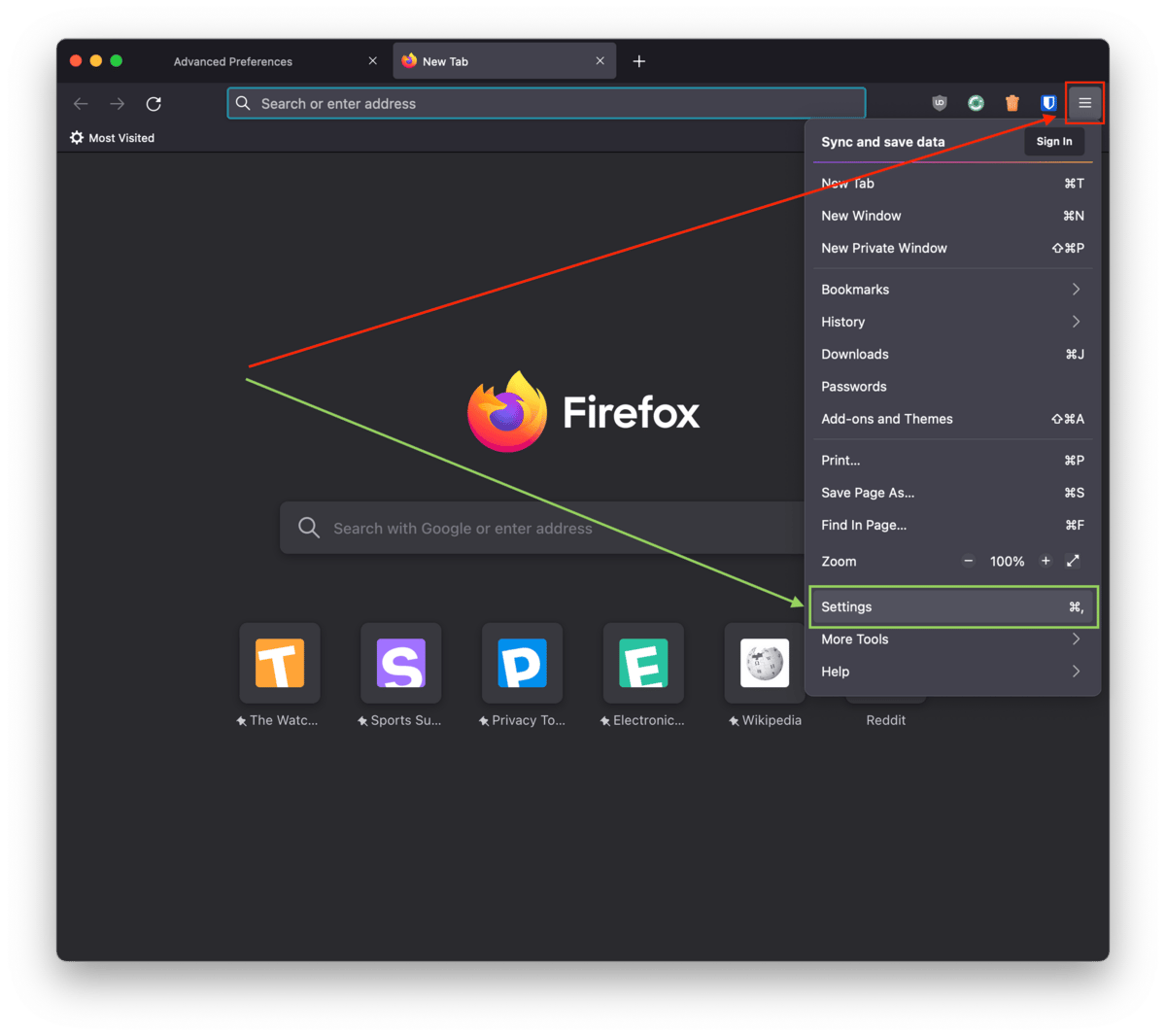 Like most applications, you can easily access Firefox’s main preferences. To do so, click on the “hamburger” icon at top left in the application window and select “Settings” from the drop-down menu as shown here in Firefox v.90.0.2: