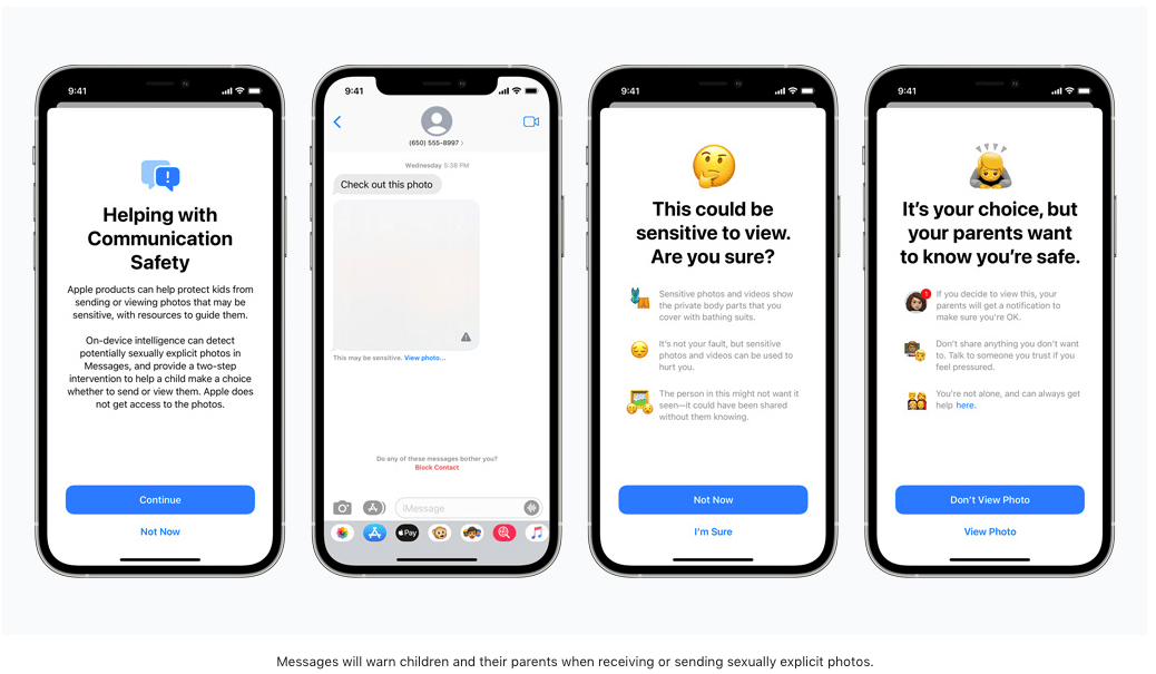 The Messages app will now include a parental control feature. If this feature is activated - and it is not by default - it alerts minors that an image they’ve received may be sexual in nature. The minors then have a choice whether to view the image or not. If they DON’T view the image(s) in question, the conversation goes unreported. If they DO elect to view the image(s) in question and they are 12-years-old- or younger, their parents or guardians will be notified. Apple illustrates how this feature will work: